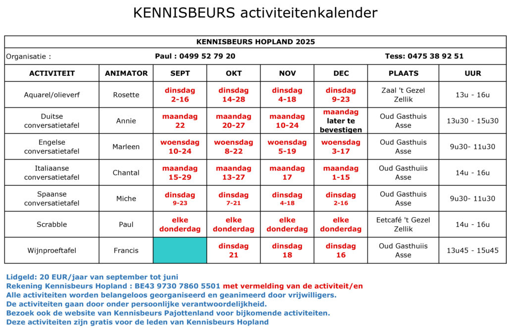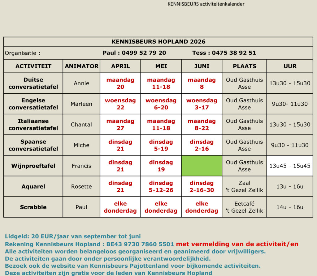 KB HOPLAND Kennisbeurs Hopland is een zustervereniging van Kennisbeurs Pajottenland. Alle activiteiten vinden plaats in het “Oud Gasthuis”Gemeenteplein 26, 1730 Asse. Paul (Voorzitter): paulvanbilsen1@gmail.com – Gsm 0499/527920 Tess (Secretaris): tdsteam@telenet.be – Gsm 0475 / 389251 Activiteiten wekelijks: scrabblemaandelijks: wijnproeftafeltwee keer per maand: conversatietafels Engels (volzet) – Spaans – Duits – Italiaanstwee keer per maand: aquarel / olieverf Activiteitenkalender